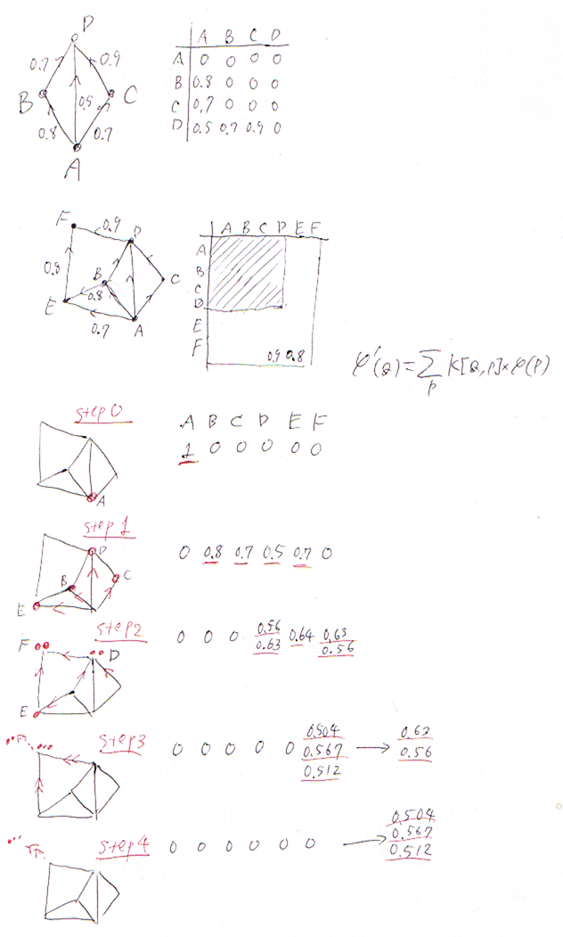 2008-01-31 氷運搬問題の例 DFD 具体例 説明 計算 以下は、氷運搬問題の例(説明は下): A,B,C,Dの4頂点と、それを拡張した6頂点のグラフ上の力学系。重み付き隣接行列をKとする。 頂点に分布された氷の量φが状態関数=波動関数=コスト関数となる。φ' = Kφ が系の発展方程式。 頂点Aにだけ分布しているδ関数の状態から出発して、伝搬をペトリネットのトークン(コイン)のように図示した。φに対する掛け算は実行し、足し算は保留している。 Aから出発した“波”が、step 2でFまで届き(第一波)、step 3でも次の波(第二波)が届いているのがわかる。