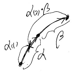 α, βはグラフ上のパス。積は連接で与えられる。積を適当な係数のベクトル空間に拡張しているけど、連接ができないときは0にする。Δ(x) は、パスxを“因数分解”した結果(複数)をテンソル積と和で列挙した形。左辺に登場する「・」は、もとの積をテンソル積空間に拡張したもの。モノイドの直積に積を入れるのと同じ。