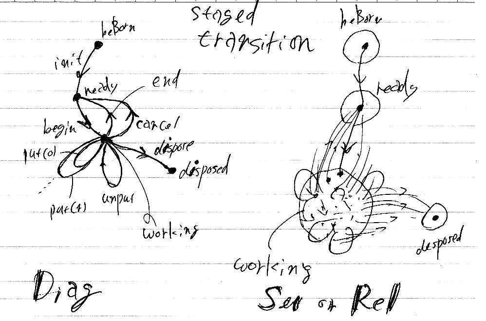 上の図で注意すべきは、ステージは単なるラベル付き頂点だが、ステージに対応するのはSetまたはRelの対象なので、要素(点)を持つ状態空間である。beBornやreadyなどの状態空間は単元集合となる。ステージ(の記号)、単元の状態空間、状態点をシッカリ区別せよ。