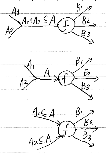 これは、直観主義論理のシーケントの左右を逆にした形をしている。排他的とは限らないユニオン型を∪で表すとして、上記のスパイダー射は、f :: A -> (B1∪B2∪ ... ∪Bn) と似てるが異なる。グラフノードとして、「出る辺の数が違うので違う」と思っておけば当面は十分である。