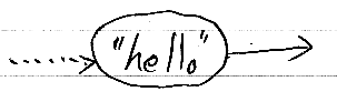 literal(x) を、データインスタンスxのリテラル射と呼ぶ。リテラル射は、xのリテラル表現をラベルとする計算ノードとして描かれる。ただし、出力型は Singleton(x) に決まっているのでラベルしなくてもよい。(以下の図の出力形は、{"hello"} というシングルトン型。)
