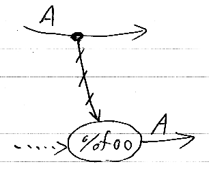 「>」が変数生成の演算子、「%」が変数参照の演算子となっている。変数生成はワイヤー上に乗った変数ポイントで表す。型Aの変数参照は、void -> A の計算ノードとして表すが、変数ポイントからの変数参照ワイヤーを描く。変数参照ワイヤーは、通常のワイヤーとは区別される。プログラム描きのときはワイヤー(有向辺)の色を変える。モノクロ手描きのときは、適当な間隔で短い斜め棒を添えて変数参照ワイヤーを識別する。斜め棒は、「制御はこのワイヤーを通らない」という意味合いである。