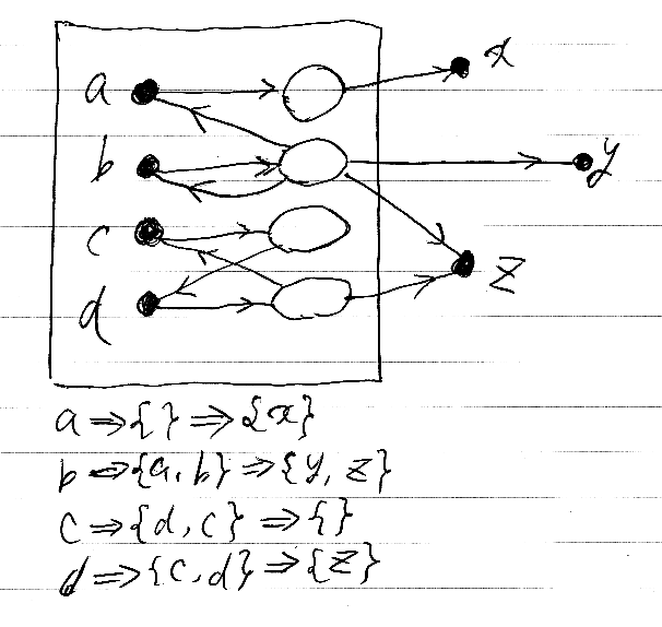 四角枠=名前空間=束縛セット=置換 の黒丸の集合(名前の集合)に関して、再帰的連結成分を完全に求めることは非常に重要である。再帰的連結成分を単一のノード(例えば二重枠の白丸とか)にして、名前と定義体を結ぶ矢印を加工すると、再帰的定義の解釈ができる。