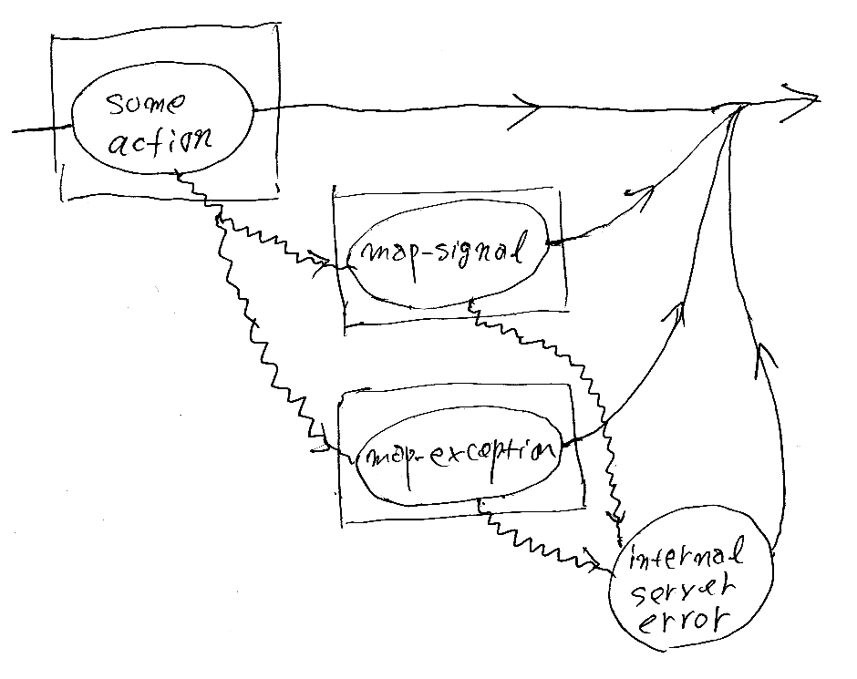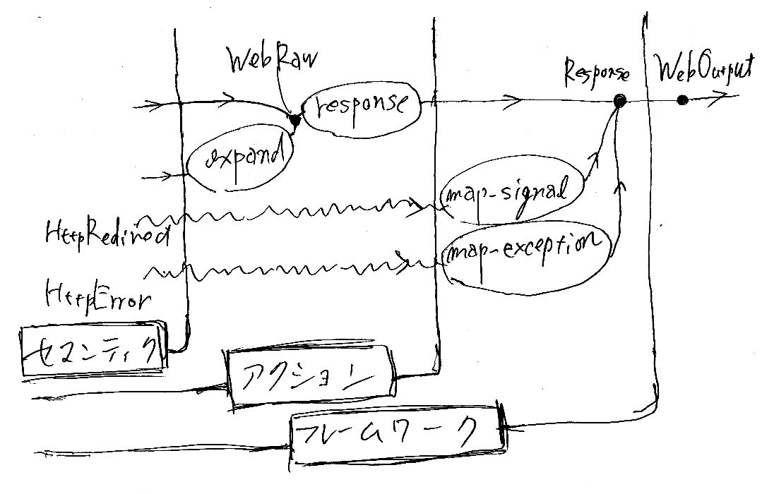 アクション内で発生したシグナルと例外は、map-signal, map-exception に渡される。上の絵に描いてないが、Web出力ラッパー内の expand, responsも例外を引き起こすリスクがある。map-signal, map-exception の例外に関しては最終的にフレームワーク(Webシェル)が面倒を見る。