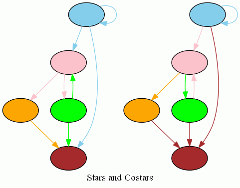 ノードと辺(矢印)からなるグラフを色塗りしている。各ノードは別な色にして、辺も塗り分けてある。二通りのルールで、辺を彩色している。どのようなルールかは簡単に推測できるだろう。