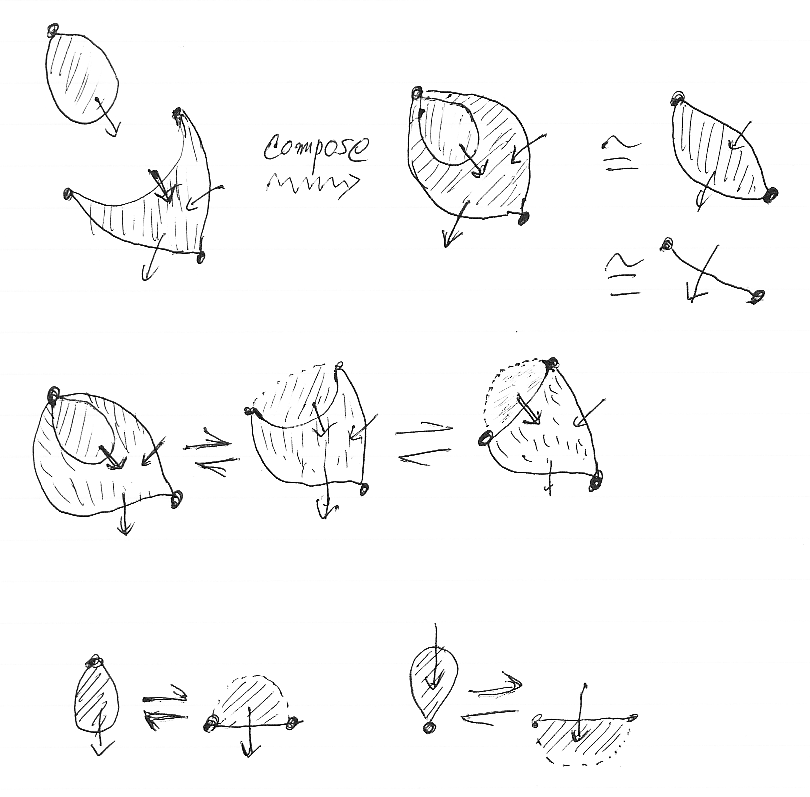 図の説明: 上段左は単位元と二項演算の一部結合、結果は右の紡錘形で、それが潰れて単なる辺と同じ。左単位律を表している。