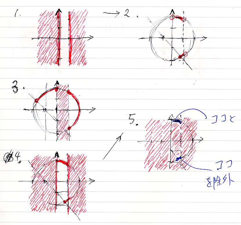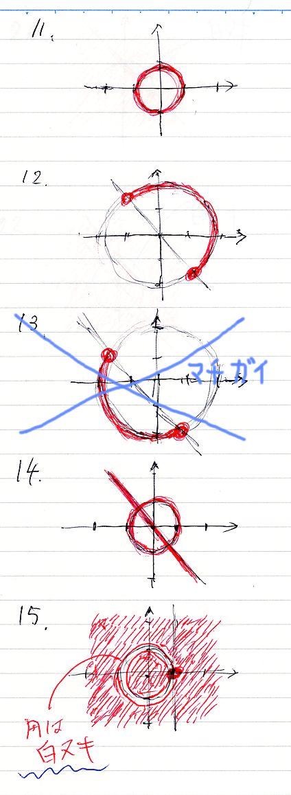 15は汚いですが、円周が白ヌキ(補集合、反例)です。が、点 (1, 0)は赤(正例)です。