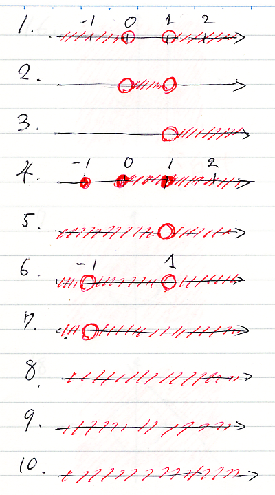 1から10のスコット・ブラケットを図示すると次のようです。コンテキスト領域は、R = 直線 で、赤い所がスコット・ブラケットの値(真理集合)です。赤くない所は真理集合の補集合、つまり反例集合です。