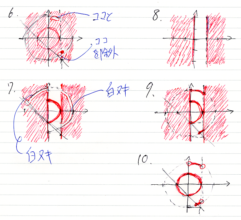 問題11から15の図は次のようになります。13は間違っていたので、後から描きなおしています。コンテキスト領域は、R×R = R2 = 平面 で、赤い所がスコット・ブラケットの値(真理集合)です。赤くない所は真理集合の補集合、つまり反例集合です。
