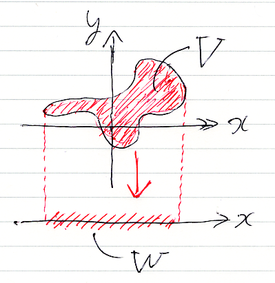 〚x∈R, y∈R| A〛は、コンテキスト領域R2内の部分集合(平面内の図形)なので、それをVと置きます。存在命題のスコット・ブラケット〚x∈R| ∃y∈R.A〛は、集合Vを射影した像です。上の図で射映像はWとなっています。